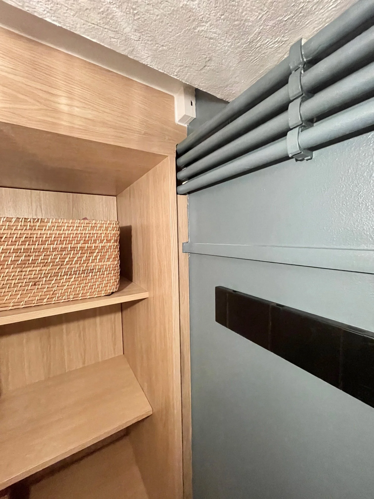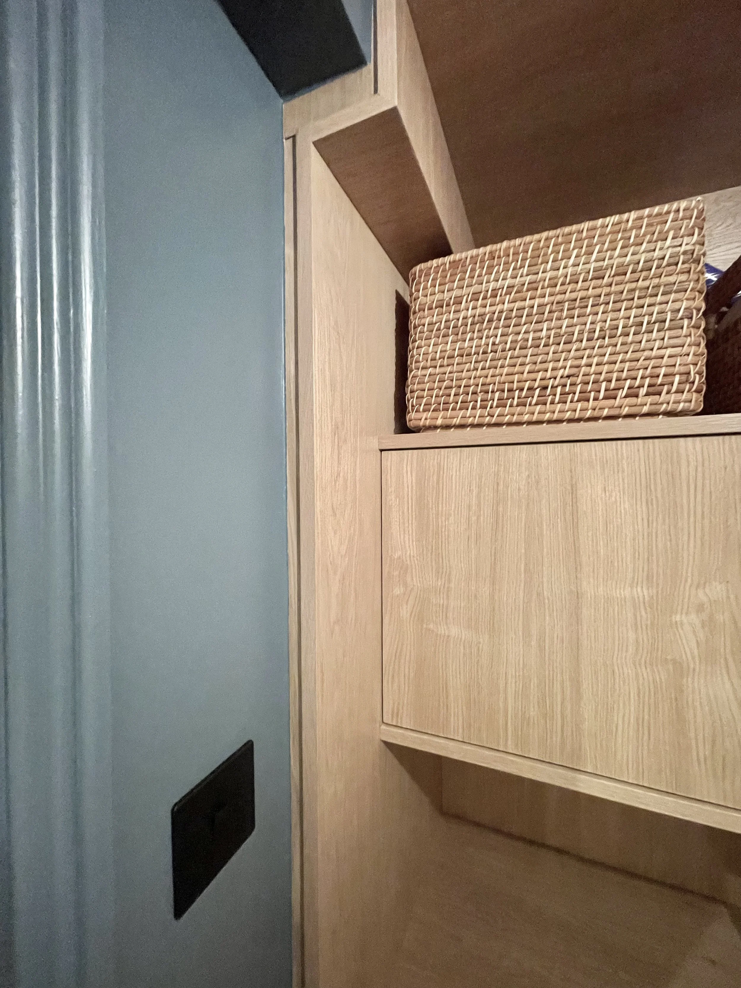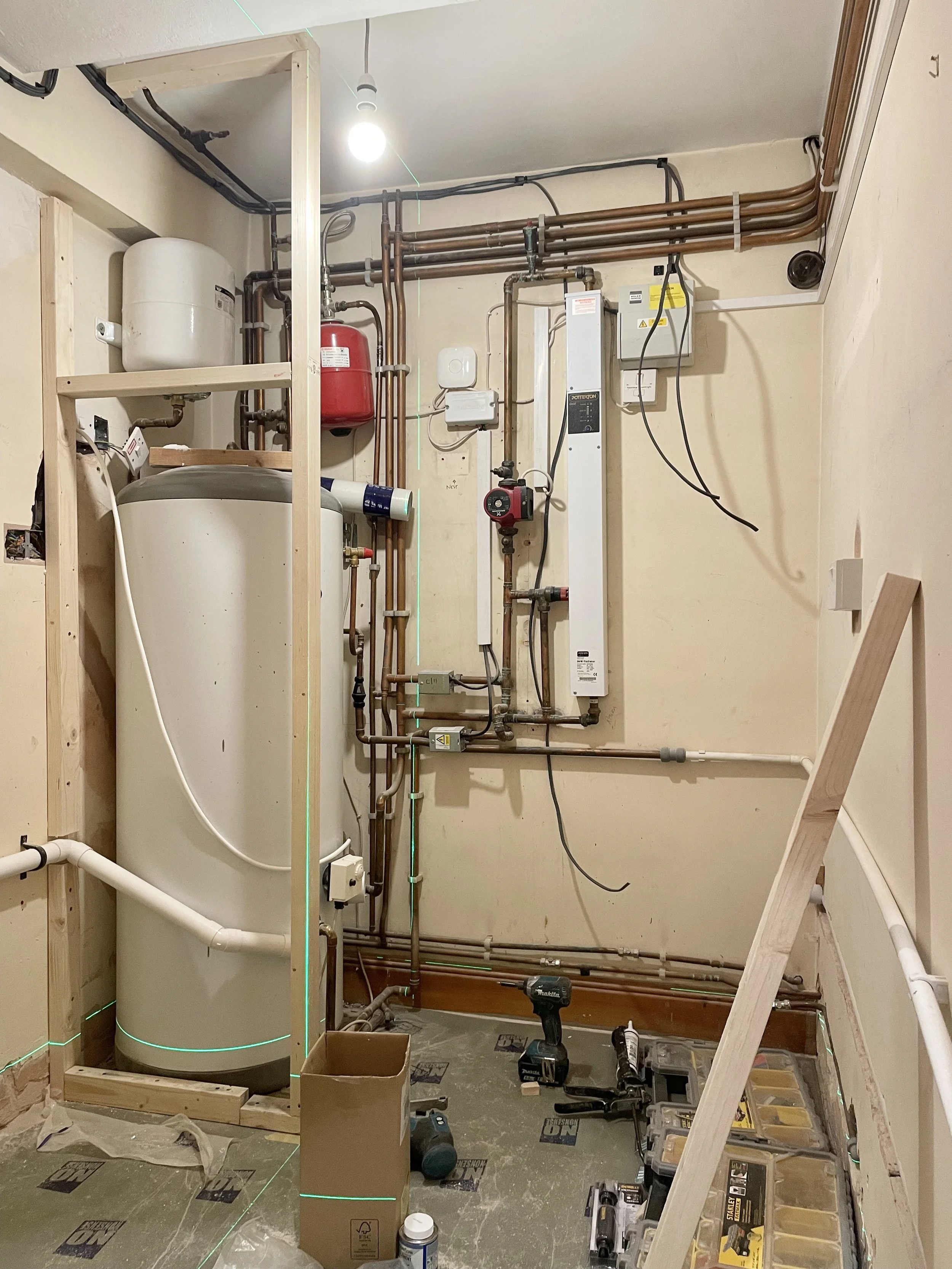 A straight forward task: make the most out of the available utility space which has to house a separate washer and dryer. The solution is covering boiler and electrics along walls. All panels are linked with magnets, easily removable if access is needed to any electrical elements.